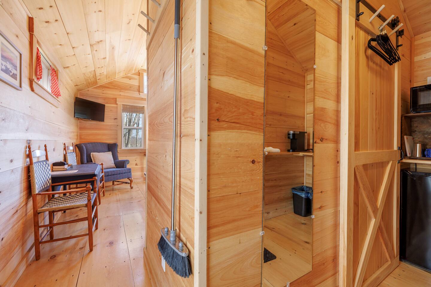Our property features six eco-modern tiny cabins, tucked in a quiet forest just a short walk from Sandy Point Beach. Each blends the charm of camping with hotel-like comforts for a true Maine glamping experience. Inside the Cabin • Queen bed with fresh linens • Air conditioning & heating • Private bathroom with shower • Mini-fridge & Keurig coffee/tea maker • TV & Wi-Fi for convenience Outside the Cabin • Private seating area with Adirondack chairs among cedar trees • Shared firepit & wood-fired cedar sauna • Easy access to hiking trails, coastal towns, and Maine’s coast Perfect for couples or solo travelers looking to combine the simplicity of camping with the comfort of a modern retreat.